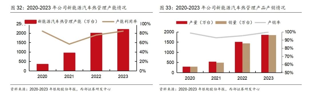 新能源汽车热管理产能持续扩张,2020-2023年CAGR达85%。公司近年来持续加码新能源汽车热管理产能规模,2023年产能规模达2200万台,2020-2023年CAGR达85%;2023年产能利用率达84%,同比+8.4pcts,对应全年产量/销量1856/1851万台,产销率接近100%。