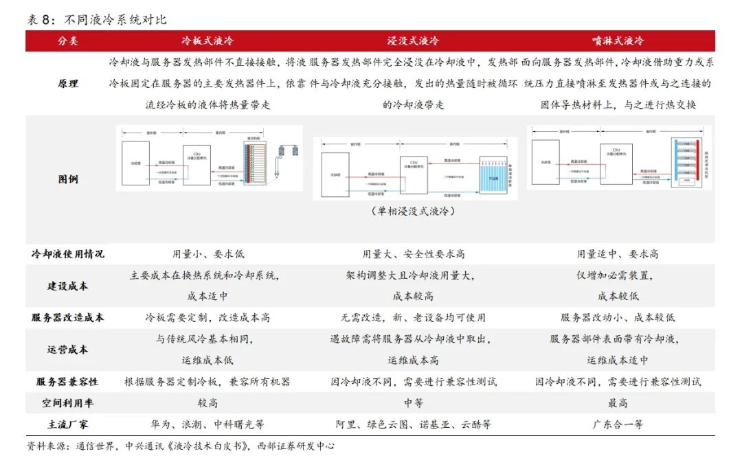 冷板式液冷仍为行业主流方案,浸没式液冷具备更优的制冷效率,未来占比有望提升。液冷方案主要分为接触式和非接触两种。接触式方案指冷却液体与发热器件直接接触的一种液冷实现方式,主要包括浸没式液冷和喷淋式液冷。非接触式方案即冷却液体与发器器件不直接接触,以冷板式液冷方案为代表。目前,受传统数据中心对原有基础设施改造成本的难度的制约,冷板式液冷方案成熟度较高,根据IDC,2023年H1,中国数据中心冷板式液冷市场占有率达90%,具备良好商业基础,预计未来几年仍将是行业主流方案。