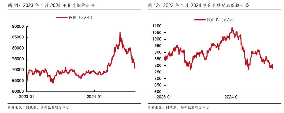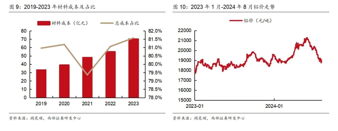 材料成本占比超80%,上下游价格联动平缓原材料上涨风险。公司主要原材料包括铝、钢、铁、铜等金属材料,2023年公司材料成本达70亿元,占总成本比重82%,原材料价格波动将直接影响公司的整体盈利水平。今年上半年,伴随制造业回暖带动铝、铜等金属材料需求提升,原材料价格出现短暂向上波动;截至2024年8月9日,铝价/铜价回落至1.9/7.2万元/吨,较上半年峰值分别回落10%/18%,铁矿石价格下降至775元/吨,较年初下降27%。为应对原材料价格波动,公司已与下游客户建立大宗原材料价格联动机制,同时会择时向上游供应商采取锁量锁价措施平缓价格上涨影响。我们认为,在公司内部管理持续降本增效下,伴随原材料价格回落,公司盈利能力仍有望进一步提升。
