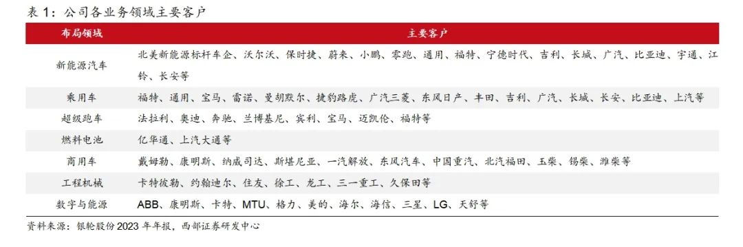 客户矩阵持续开拓,全球属地化布局满足客户需求。公司早期客户以商用车工程机械客户为主,先后与康明斯、中国重汽、潍柴、卡特彼勒等国内外相关领域龙头企业达成合作。伴随乘用车领域拓展,公司前瞻把握新能源产品布局,先后与北美新能源标杆车企、吉利、比亚迪、长安等国内外头部主机厂达成合作。此外,公司持续发力数字与能源第三成长曲线,目前已与ABB、卡特、格力、LG等各领域龙头企业达成合作。