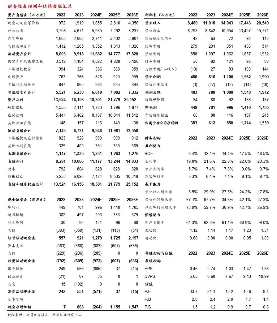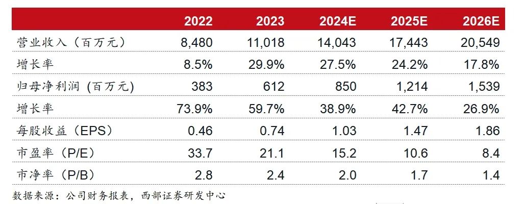 我们预计2024-2026年公司营收140/174/205亿元,同比+27%/+24%/+18%,归母净利润8.5/12.1/15.4亿元,同比+39%/+43%/+27%,对应当前股价PE15.2/10.6/8.4X。首次覆盖,给予“买入”评级。