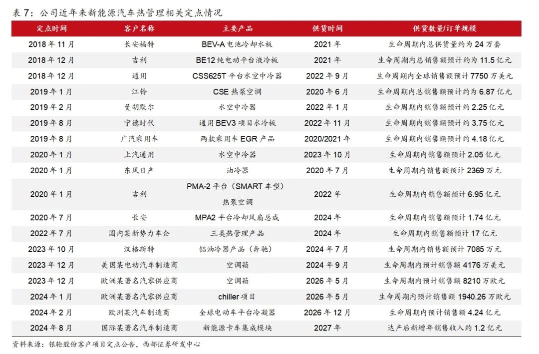 聚焦全球化新能源化,客户+产品双向拓展。目前,公司在不锈钢油冷器、EGR冷却器、缓速器油冷器、非道路冷却模块等传统产品保持技术领先优势,未来将持续发挥全球属地化优势,持续拓展国际业务。此外,公司聚焦新能源产品战略,构建新能源产品自主开发能力,2023年实现BTMS、TMS和水路集成模块从0到1突破,同时在商用车新能源用换热器、电池及电驱热管理系统、集成模块均已实现突破。2024年8月,公司国际某著名汽车制造商新能源卡车集成模块项目定点,预计2027年开始批量供货,达产后新增年均销售收入1.2亿元,实现海外新能源商用车业务重要突破。
