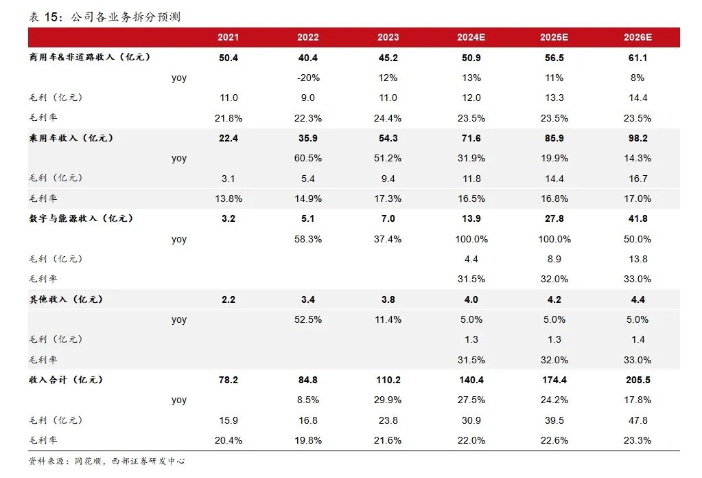 乘用车业务营收占比提升,各项业务毛利率持续改善。2023年公司商用车非道路/乘用车/数字与能源业务分别实现营收45/54/7亿元,同比+12%/+51%/+37%,占比41%/49%/6%,其中乘用车业务受益新能源产品放量,营收占比首次超过商用车非道路业务。盈利方面,2022年以来各项业务毛利率持续改善,2023年商用车非道路/乘用车业务毛利率分别为24%/17%,同比+2.1/2.4pcts。
