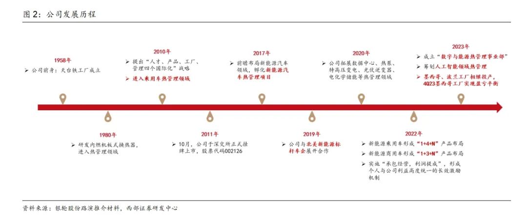 四十余年匠心深耕,打造国内热管理行业龙头。公司最早成立于1958年,1980年通过研发内燃机板式换热器正式入局热管理领域。2010年,公司进入乘用车热管理领域,次年于深交所正式挂牌上市。2017年,公司前瞻布局新能源汽车领域,率先与北美新能源标杆车企达成合作,开启第二成长曲线。2020年,公司由车端热管理开始向数据中心、光伏、储能等热管理领域拓展,2023年成立数字与能源热管理事业部,打造第三成长曲线。此外,公司持续加快全球化布局,2023年墨西哥、波兰工厂相继投产,属地化制造能力大幅提升,后续有望逐步进入盈利释放周期,成为推动公司业绩增长关键动力。