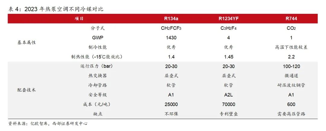 相比之下,R744(CO2)具备环保、价格低廉(仅600元/吨)、来源广泛等多重优势,同时-15℃下能效比可达2.2,高出R1234YF 50%以上,目前已在奔驰E/S级、奥迪A8、大众ID.4等多款车型实现量产,同时长安汽车、上汽大众、蔚来、北汽等多家主机厂已开启相关系统研发,预计未来有望成为热泵空调冷媒主流趋势。