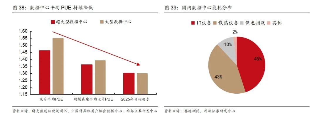 政策对数据中心PUE要求趋严,制冷系统是节能关键路径。2019年以来,国家和地方密集出台节能优化政策,新建大型、超大型数据中心PUE要求逐渐趋严(电能利用效率)。根据《信息通信行业绿色低碳发展行动计划(2022-2025年)》要求,到2025年,全国新建大型、超大型数据中心PUE降至1.3以下水平。在保障算力运转的前提下,只有通过降低数据中心辅助能源的消耗,才能达成节能目标下的PUE要求。根据赛迪顾问统计,国内数据中心能耗中,散热设备能耗占比达43%,是数据中心辅助能源占比最高部分,因此降低制冷系统能耗,将成为降低PUE关键路径。