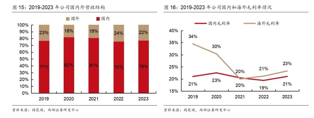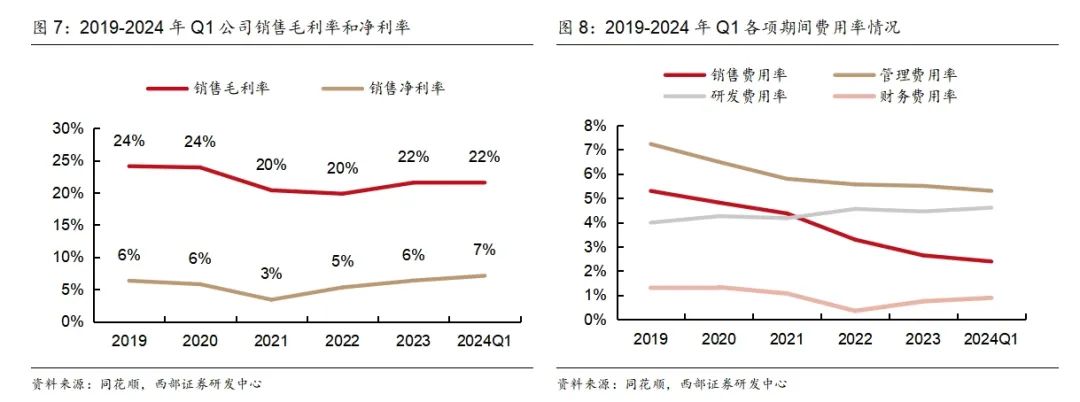 规模效应+降本增效,盈利能力持续提升。公司持续推进“降本增效”工作,2022年盈利能力迎来拐点,2023年公司销售毛利率/净利率分别为21.6%/6.4%,同比+1.7/+1.1pcts;2024年Q1公司销售毛利率/净利率分别为21.6%/7.1%,盈利能力持续改善。