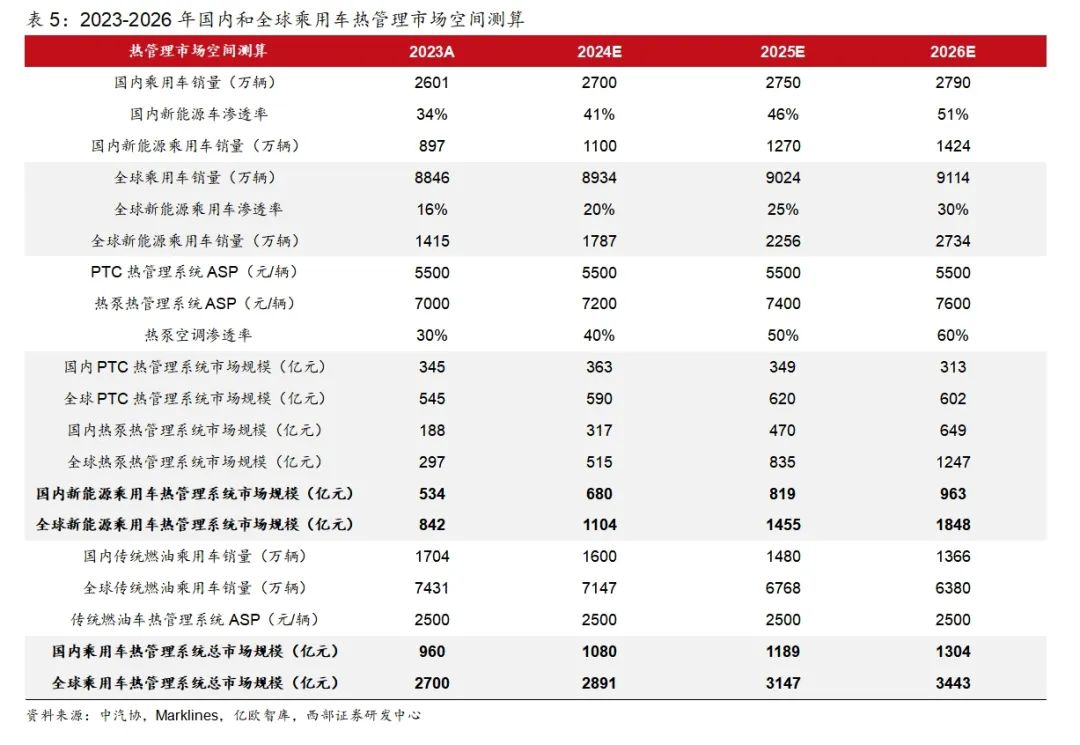 国内热管理市场空间:预计2024-2026年国内乘用车热管理系统总市场规模1080/ 1189/1304亿元,其中新能源乘用车热管理系统市场规模680/819/963亿元。