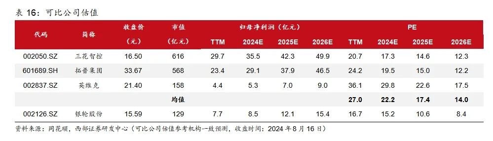 我们预计2024-2026年公司营业收入分别为140/174/205亿元,同比+27%/+24%/+18%;归母净利润分别为8.5/12.1/15.4亿元,同比+39%/+43%/+27%,对应当前股价PE15.2/10.6/8.4X。我们选取拓普集团、三花智控、英维克国内三家上市公司作为可比公司,其中拓普集团、三花智控主营业务均为汽车零部件,产品涉及阀类、泵类及其他热管理组件,且均为细分领域龙头;英维克是国内精密温控节能领域龙头,主营业务为云计算数据中心、储能系统等领域提供设备散热解决方案,与公司第三曲线数字与能源业务相似度较高。三家可比公司2024-2026年PE均值为22.2/17.4/14.0X(估值时间:2024年8月16日)。此外,结合公司近三年市盈率(TTM)走势,三年期PE均值30X,当前市盈率(TTM)仍处于底部区间(1.33%分位数)。因此,给予2024年PE 20X,目标价20.54元。首次覆盖,给予“买入”评级。