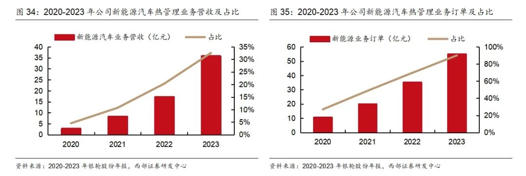 新能源汽车业务订单饱满,业务占比持续提升。2023年,公司累计获得223个项目,根据客户需求及预测,生命周期内新获项目达产后将为公司新增年销售收入超61亿元,其中新能源业务订单占比超90%,包括北美客户芯片冷却系统及超充冷却模块、比亚迪电池冷却板及冷却模块、宁德时代水冷板、国内造车新势力芯片冷却及集成模块、欧洲客户空调箱等关键定点。2023年公司新能源汽车业务营收达36亿元,同比+108%,占比33%,同比+12.2pcts;2020-2023年营收CAGR达131%。