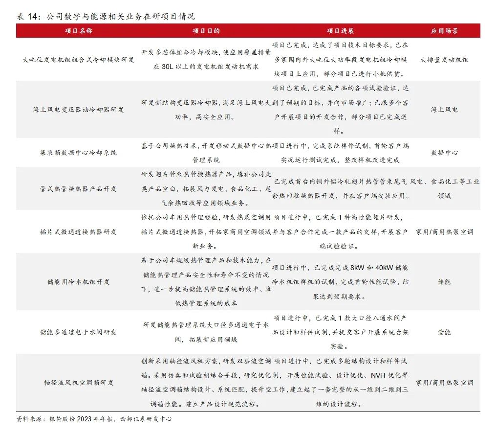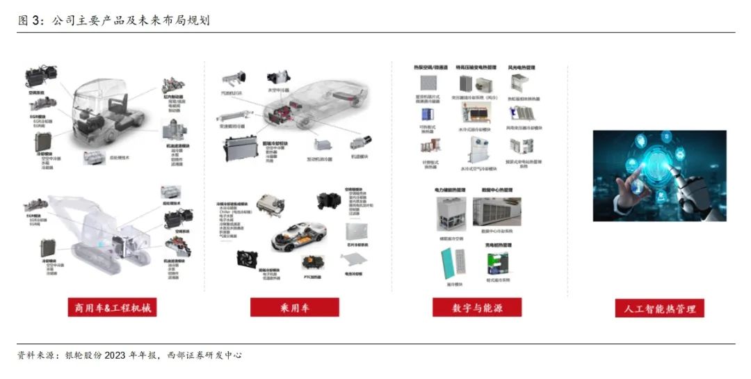 产品曲线持续拓展,由车端热管理走向全场景应用。公司车端热管理已实现商用车、乘用车、工程机械全领域覆盖,其中在商用车非道路方面,持续保持不锈钢油冷器、EGR冷却器、缓速器油冷器、非道路冷却模块等产品技术领先优势,并在新能源商用车领域形成了以HVAC模块、TMS热管理模块、智能冷却模块为核心的“1+3+N”产品布局;乘用车方面,公司在传统乘用车基础上,形成以前端模块、空调箱模块、冷媒冷却液集成模块、车载电子冷却系统为核心的“1+4+N”新能源乘用车产品布局。在车端应用基础上,公司开辟第三成长曲线,由车端应用走向数字与能源热管理,优势赋能储能、变电、超充、数据中心等领域,实现技术性能、制造成本、产品质量多重优势。此外,公司2023年提出第四成长曲线——人工智能热管理,积极探索技术路线与应用场景,并相应开展前沿技术研究,布局相关技术专利,为中长期发展奠定基础。
