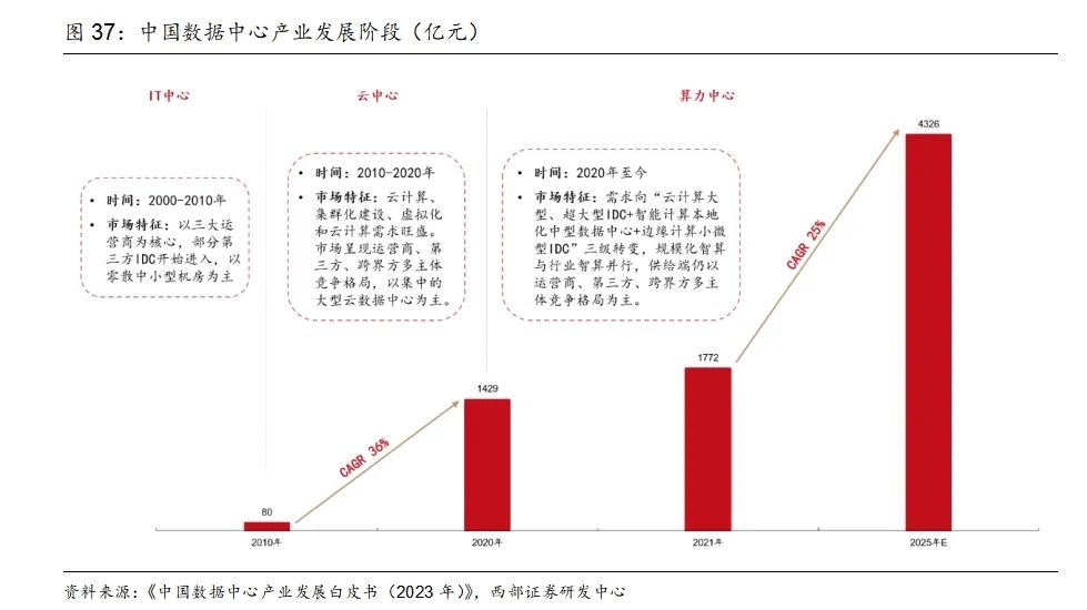 国内数据中心产业较全球起步较晚,当前处于算力中心早期增长阶段,预计2021-2025年CAGR达25%。我国数据中心产业发展较美国落后3-5年,2020年以来,伴随云计算、大数据、AI等数字技术发展,智能算力、边缘算力、云存储等需求持续释放,叠加AI发展进入多模态和大模型2.0时代,推动我国数据中心产业进入新阶段。2021年在“东数西算”等多要素推动下,国内数据中心产业规模达1772亿元,同比+24%,市场需求开始向“云计算大型、超大型IDC+智能计算本地化中型数据中心+边缘计算小微型IDC”三级转变。根据《中国数据中心产业发展白皮书(2023)》,预计国内数据中心产业2021-2025年CAGR将达到25%,对应2025年产业规模将达到4326亿元。
