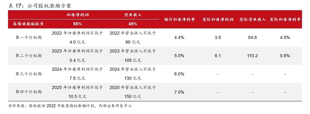 股权激励目标明确,持续兑现凝聚内生动力。2022年,公司推出股权激励方案,以2022-2025年营业收入和归母净利润作为绩效衡量指标,指标权重分别为45%和55%,要求2022-2025年归母净利润分别不低于4.0/5.4/7.8/10.5亿元,营业收入不低于90/108/130/150亿元,对应归母净利率目标4.4%/5.0%/6.0%/7.0%。2023年,公司分别实现营业收入/归母净利润110.2/6.1亿元,实际归母净利率5.6%,达成年度业绩目标,实现股权激励计划稳步推进,进一步提升核心员工积极性,释放公司内生动力。