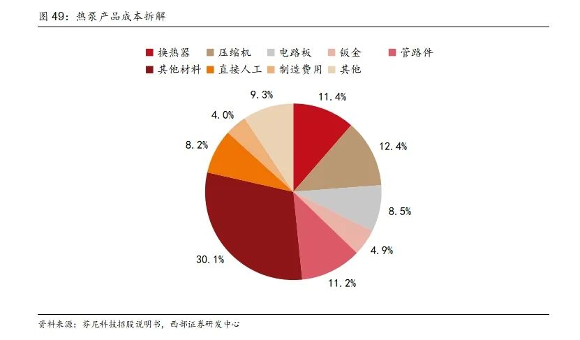 换热器、压缩机占热泵成本比重较高,上游供应商有望受益市场扩容。热泵主要组成部件包括压缩机、冷凝器、蒸发器、膨胀阀等。根据芬尼科技招股书披露,2023年公司热泵产品直接材料主要包括换热器、压缩机、钣金、电路板、管路件等,合计占比78.5%,其中换热器、压缩机占总成本比重11.4%和12.4%,采购均价分别为677和812元。我们认为,伴随热泵市场规模持续扩容,将为换热器、压缩机等上游材料供应商带来新增长点。