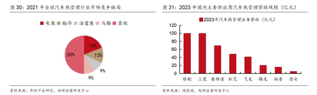 外资主导全球汽车热管理市场,国产供应商加速追赶。长期以来,电装、法雷奥、翰昂、马勒等全球Tier1凭借成熟技术经验、丰富产品矩阵和系统化集成能力,主导全球汽车热管理市场,2021年四家全球Tier1累计市占率达50%。目前,国内汽车热管理赛道玩家众多,其中银轮股份和三花智控营收规模保持行业领先,2023年汽车热管理业务收入分别为99.4/99.1亿元,同比+30%/+32%,加速追赶全球Tier1。