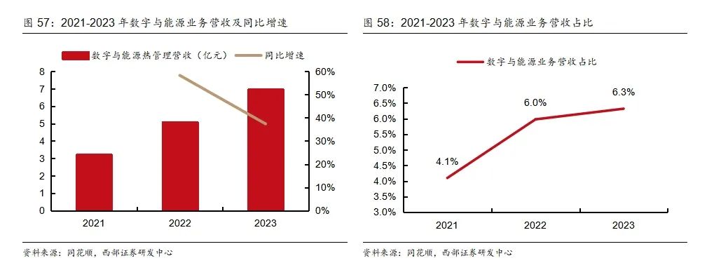 数字与能源业务:2023年公司成立“数字与能源热管理事业部”,围绕数据中心液冷、发电及输变电、储能及PCS液冷系统等新应用领域,打造第三增长曲线。2023年公司陆续获得阳光电源储能及光伏逆变器液冷机组、国际客户发电机组冷却模块、国内头部客户储能液冷、三变和江变等客户铝片式变压器换热器、日立能源等风电变压器换热器等项目,在手订单充沛,储能、数据中心、家用/商用热泵空调等领域持续突破,未来有望成为公司关键增长点。我们预计2024-2026年公司数字与能源业务营收14/28/42亿元,同比+100%/+100%/+50%;伴随各项业务逐步成熟,盈利能力有望持续改善,预计2024-2026年毛利率31.5%/32%/33%。