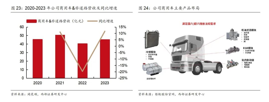 商用车业务受益行业复苏,天然气重卡有望贡献板块核心增长。公司深度绑定戴姆勒、康明斯、潍柴、东风、重汽、一汽等头部商用车客户,受益于2023年行业持续复苏,公司商用车非道路业务实现营收45亿元,同比+12%。天然气重卡方面,公司EGR模块为天然气重卡标配,该产品国内市占率达90%以上,预计未来伴随天然气重卡渗透率持续提升,EGR模块有望成为板块营收核心增量。
