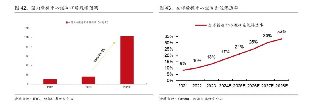 数据中心液冷渗透率持续提升,国内市场有望迎来高速增长期。我们认为,数据中心液冷技术同时满足高功率密度制冷需求和低PUE节能要求,未来将成为数据中心制冷主流方案。根据Omdia预测,全球数据中心液冷系统渗透率将保持逐年增长,2028年渗透率将达到33%,较2023年提升20pcts。根据IDC,2023年我国数据中心液冷市场规模为15.5亿美元,预计2028年我国数据中心液冷市场规模将达到102亿美元,2023-2028年CAGR达45.8%,有望进入高速增长阶段。