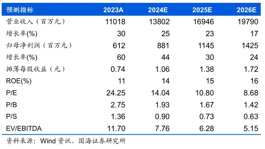 在经营制度改革、海外业务盈利能力、新业务持续开拓等正向因素影响下,公司业绩有望持续高增,我们预计公司2024-2026年实现营业总收入138、169、198亿元,同比增速为25%、23%、17%;实现归母净利润8.81、11.45、14.25亿元,同比增速为44%、30%、24%;EPS为1.06、1.38、1.72元,对应当前股价的PE估值分别为14、11、9倍,维持“买入”评级。
