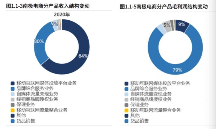 这钱是怎么赚的呢?先把“南极人”品牌授权给生产商,收一笔综合服务费;准备做销售的时候,再收一笔营销费,帮厂商或经销商在电商平台买流量,这也就形成了公司的利润来源“品牌综合服务业务”以及流水来源“移动互联网媒体投放平台业务”。