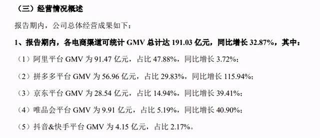 南极电商还披露了电商行业的一个重要数据GMV(总成交额),当期公司在各电商渠道可统计的GMV达191.03亿元,同比增长32.87%,其中阿里GMV91.47亿,同比47.88%,拼多多平台GMV为56.96亿元,占比29.83%,同比增长115.94%;新增的抖音&快手平台GMV为4.15亿元,占比2.17%。