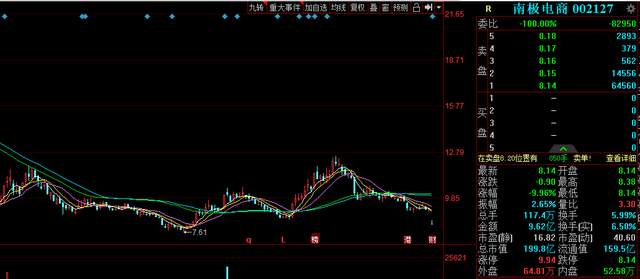 8月30日,南极电商低开低走,至下午股价跌停,封单量3万余手,截止收盘,南极电商报收于8.14元,总成交量达9.6亿,总市值为199.8亿。