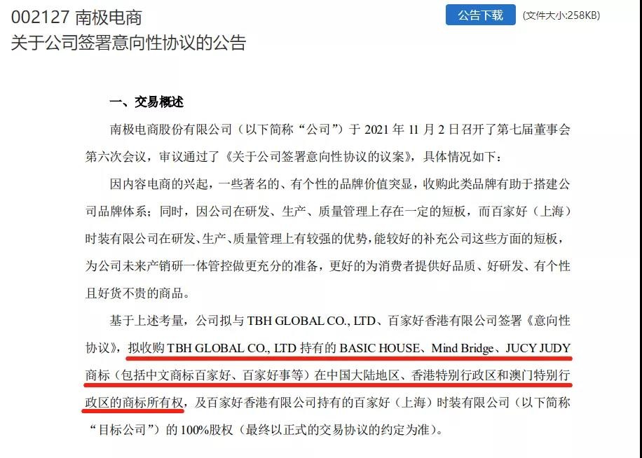 11月2日晚间,南极电商发布了一则《南极电商关于公司签署意向性协议的公告》,公告称南极电商拟与 TBH GLOBAL CO., LTD、百家好香港有限公司签署《意向性协议》,拟收购 TBH GLOBAL CO., LTD 持有的 BASIC HOUSE、Mind Bridge、JUCY JUDY商标(包括中文商标百家好、百家好事等)在中国内地地区、香港特别行政区和澳门特别行政区的商标所有权,及百家好香港有限公司持有的百家好(上海)时装有限公司的 100%股权。双方初步协商,整体交易金额为5亿元。此消息一出再次在行业内引爆!