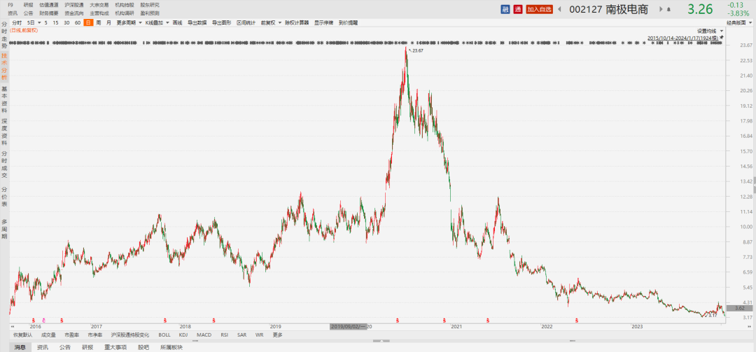“眼看他起朱楼,眼看他宴宾客,眼看他楼塌了”,这是戏曲《桃花扇》中的一段唱词。而A股市场上,近年来南极电商(002127)的股价波动可以说十分符合这句唱词,在2020年年中市值巅峰时近600亿元,股价最高达23.67元,而今股价仅有3.26元,在2023年10月23日甚至最低见3.17元,为2015年10月中14日以来的最低,市值如今也仅在80亿元左右波动。