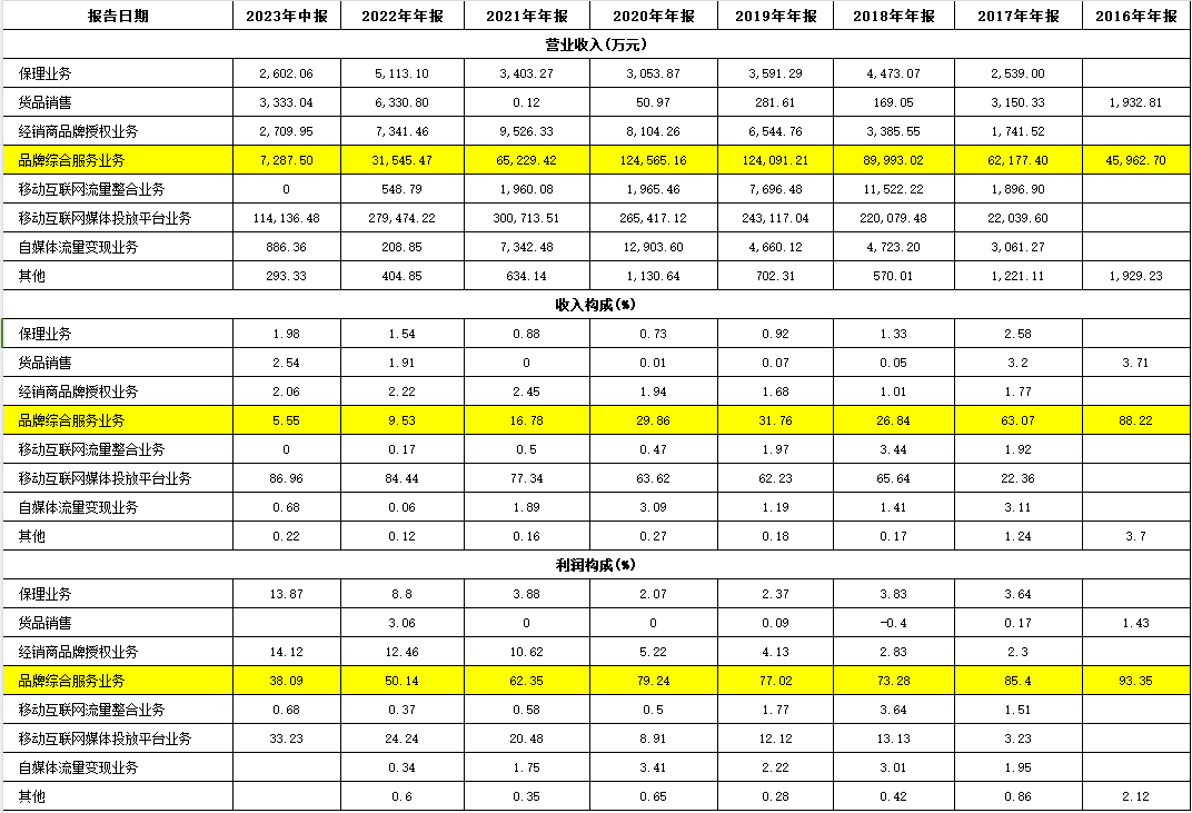 不过,从利润来看,品牌综合服务依然贡献了很大比例。2022年还依然占据了半壁江山,即使今年上半年也依然占比近四成。