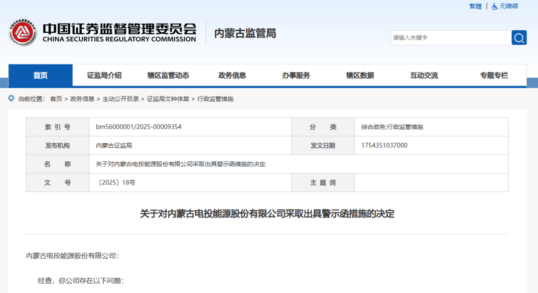 8月5日,根据内蒙古证监局发布的公告,电投能源被采取出具警示函的监管措施。