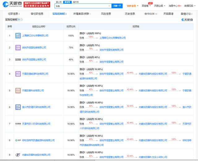 难道是数据有误?数据显示,除了上海赫亿文化传播有限公司的法定代表人是张良外,他还实际控制9家企业。