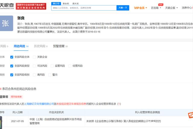 张良担任法定代表人的上海赫亿文化传播有限公司,2021年7月5日收到中国(上海)自由贸易试验区临港新片区市场监督管理局做出的决定书,该公司因未按规定提交年度报告信息而被列入企业经营异常名录,担任股东的余姚市恒星管业有限公司曾因机动车交通事故责任纠纷而被起诉、曾因提供劳务者受害责任纠纷而被起诉,担任法定代表人的内蒙古欧晶科技股份有限公司有对外担保信息。