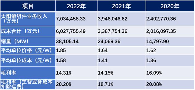 晶澳科技公告2022年光伏组件平均价格为1.85元/W,成本为1.58元。即使晶澳的组件利润中其实已经包含了硅片、电池业务的溢价,TCL中环组件的销售均价、毛利率,也不应该与晶澳有如此的差距。