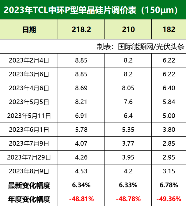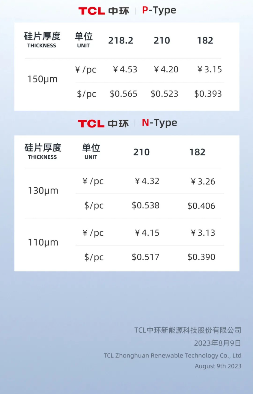 国际能源网/光伏头条(PV-2005)获悉,8月9日,TCL中环公示最新单晶硅片价格。