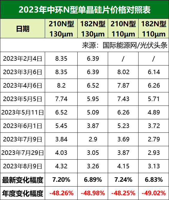 P型硅片降价的同时,N型硅片也呈现出了大幅反弹趋势。N型130微米182硅片价格每片上涨0.21元,报价3.26元/片,涨6.89%;130微米210硅片价格每片涨0.29元,报价4.32元/片,涨7.2%。