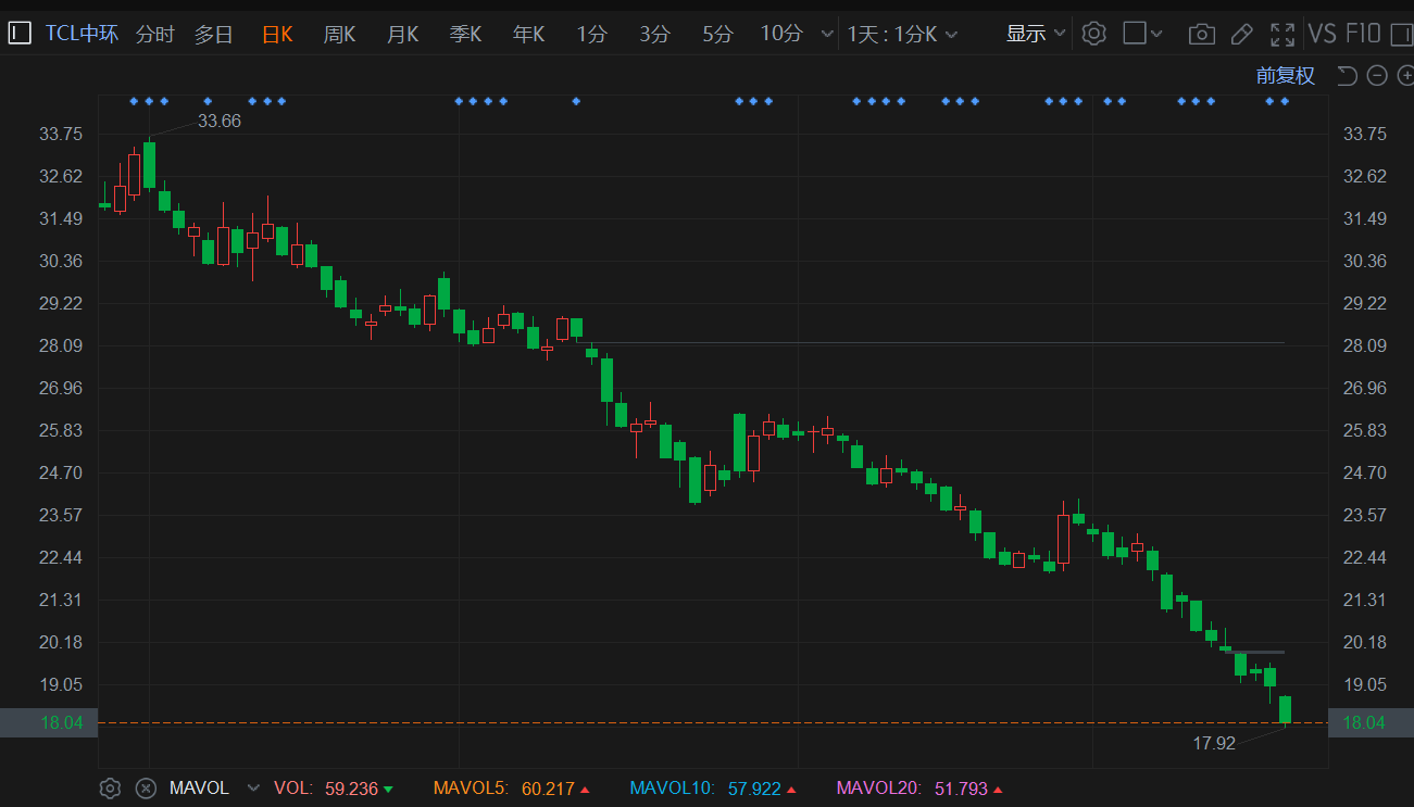 硅片龙头TCL中环(002129.SZ)再度跌超5%,股价一度跌破18元关口,且创下近3年新低,月内累计跌幅近25%,总市值729亿元。