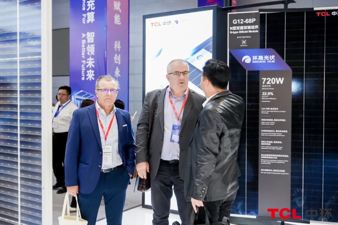 TCL中环坚定“叠瓦+G12”双平台差异化技术与产品路线,充分发挥“G12+N型+叠瓦”产业链协同优势,不断扩大叠瓦核心差异化竞争力,助推行业发展。本次展出的叠瓦组件4.0产品是TCL中环基于N型TOPCon电池+叠瓦技术推出的高效组件,经过不断的技术升级和工艺优化,N型68P双玻叠瓦组件最高功率提升至720W,最高效率达到22.9%,性能较同类产品更优异。N型68P双玻叠瓦组件首年衰减降至1%,逐年衰减0.4%,双面效率对比PERC叠瓦提高10%,在不同地表环境下双面率达到80%±5%。凭借其优异的发电性能、更高的双面效率、更低的首年衰减率和逐年衰减率,N型68P双玻组件完美满足了集中式地面电站的应用需求,为客户带来更高的发电收益、更低的度电成本,缩短投资回报周期。