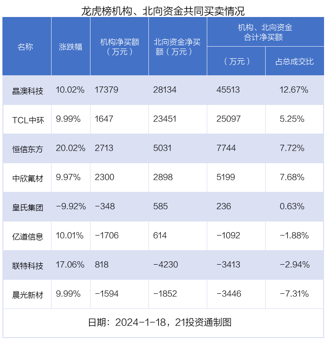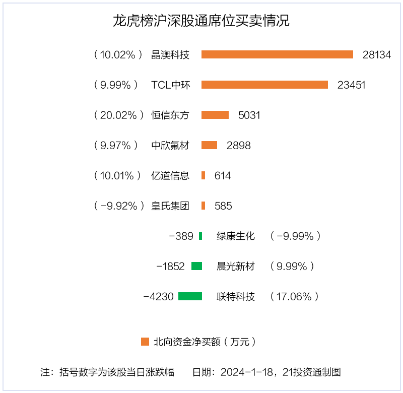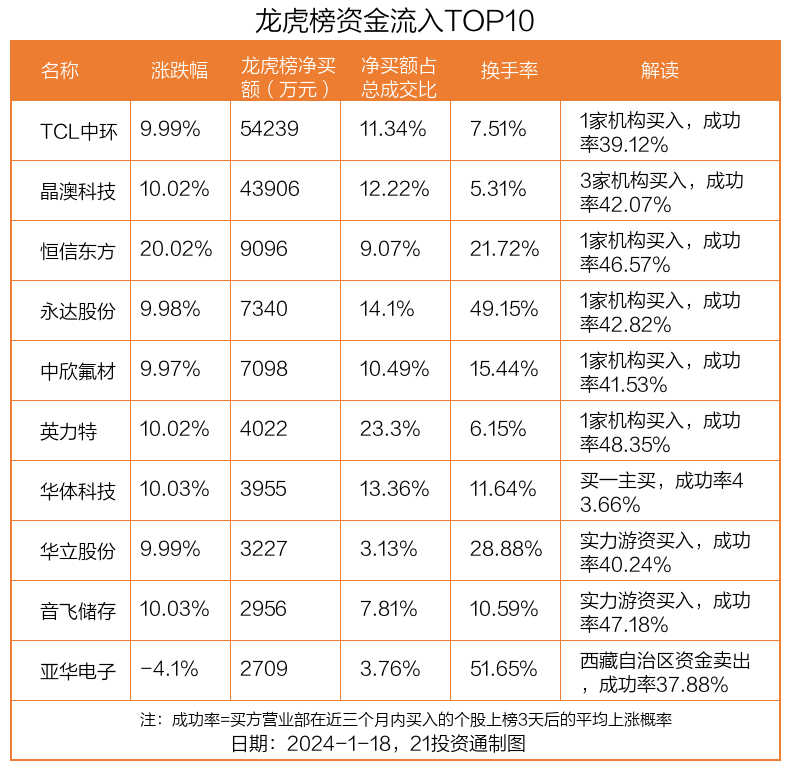 1月18日,上证指数上涨0.43%,深证成指上涨1%,创业板指上涨1.93%。盘后龙虎榜数据显示,共有42只个股因当日异动登上龙虎榜,资金净流入最多的是TCL中环(002129.SZ),达5.42亿元。