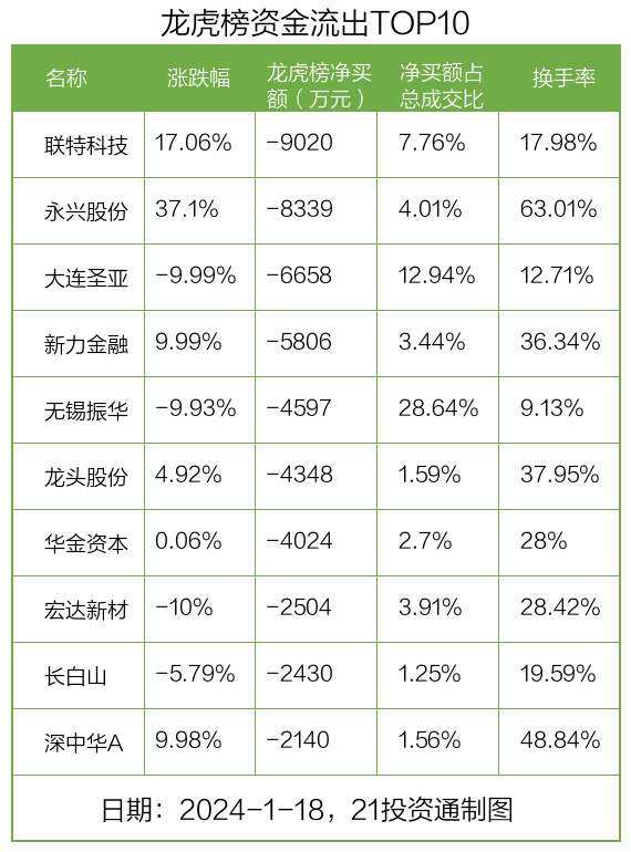 而龙虎榜中资金净流出最多的是联特科技(301205.SZ),被净卖出为0.9亿元,占总成交金额的7.76%。联特科技收盘上涨17.06%,换手率为17.98%。