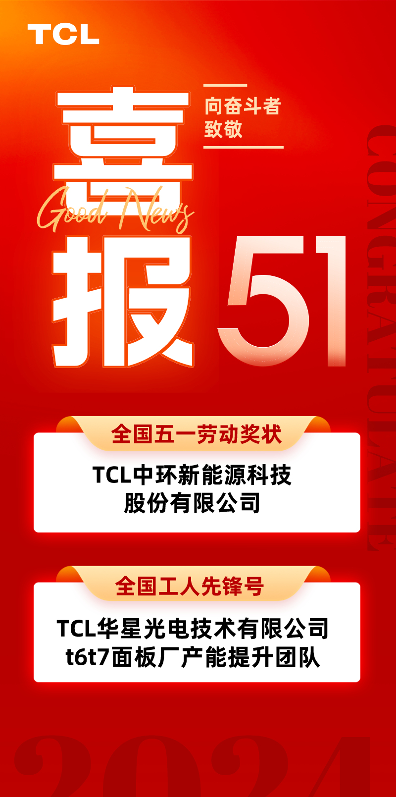 五一前夕,中华全国总工会发布《关于表彰2024年全国五一劳动奖和全国工人先锋号的决定》,TCL中环、TCL华星团队榜上有名!