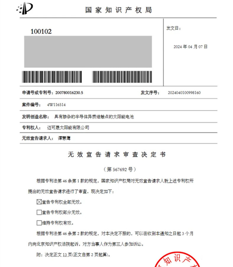 2024年4月7日,国家知识产权局公告显示,迈克晟太阳能有限公司的一件名为“具有掺杂的半导体异质结触点的太阳能电池”专利ZL200780016230.5,经合议组审理后,认为该专利不具备创造性,宣告专利权全部无效。无效请求人是一名自然人,疑似是国内某家太阳能光伏公司使用的稻草人策略。