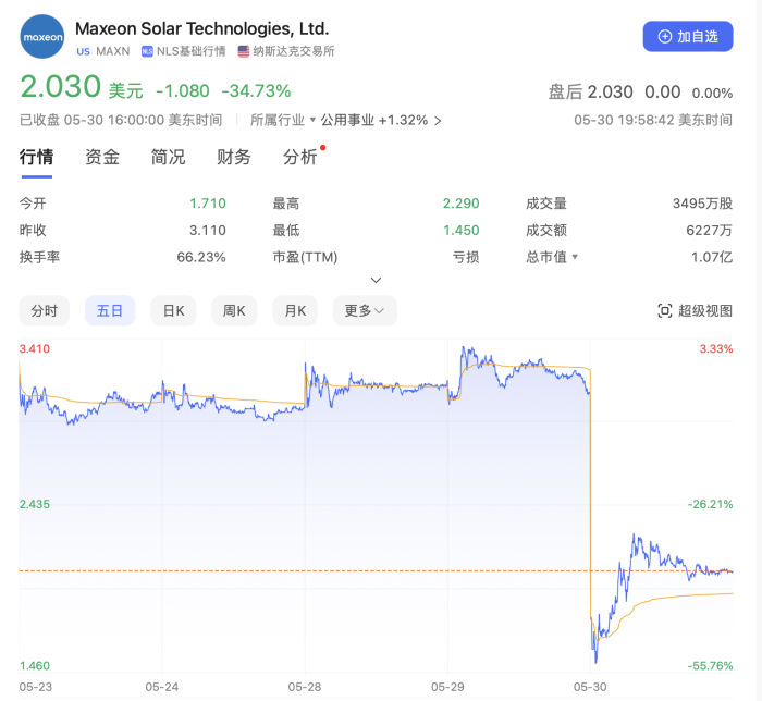 上述业绩表现均低于市场分析师预期,导致5月30日Maxeon股价一度暴跌50%。截至当天收盘,Maxeon股价跌34.73%,收于2.03美元,总市值仅剩1.07亿美元(约合7.74亿元人民币)。
