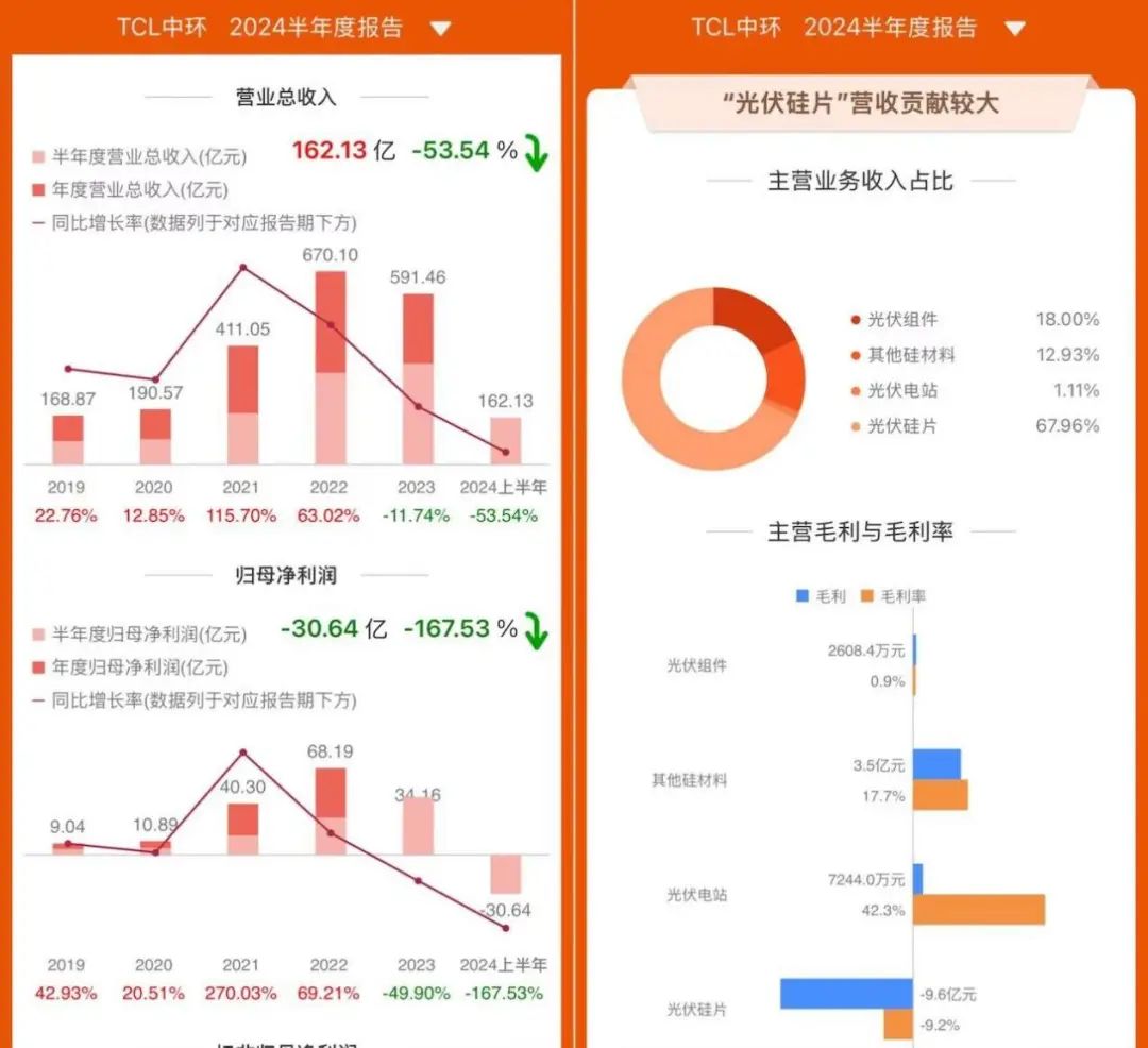 尽管声明强调请辞系“工作需要和个人精力考虑”,但公告还提到:当前全球光伏产业仍处下行周期,公司将坚持全球领先战略目标,加速变革创新,提升竞争力,努力改善公司经营业绩。2024年上半年,TCL中环营收162.13亿元,同比下降53.54%;归母净利润-30.64亿元,同比下降167.53%。其中,主营业务硅片毛利率跌至-9.2%。