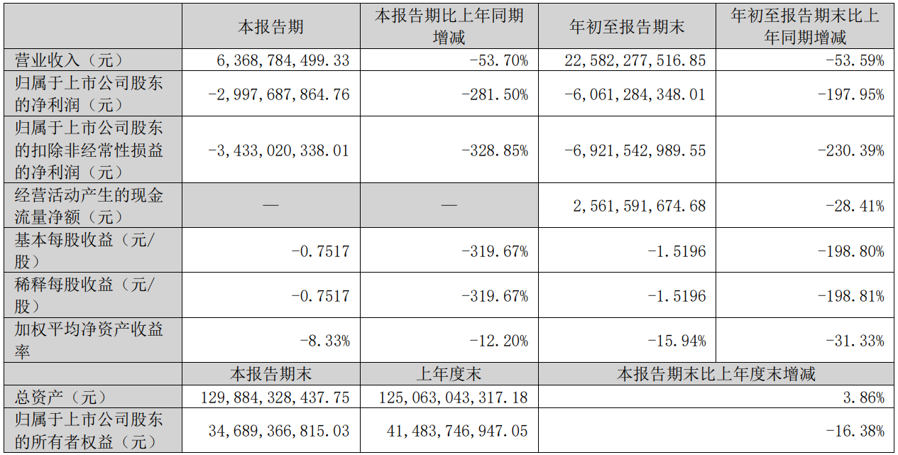 其中,第三季度实现营收6,368,784,499.33元,同比下降53.7%;归属于上市公司股东的净亏损为2,997,687,864.76元,较上年同期由盈转亏;归属于上市公司股东的扣除非常性损益的净亏损为3,433,020,338.01元,较上年同期由盈转亏。