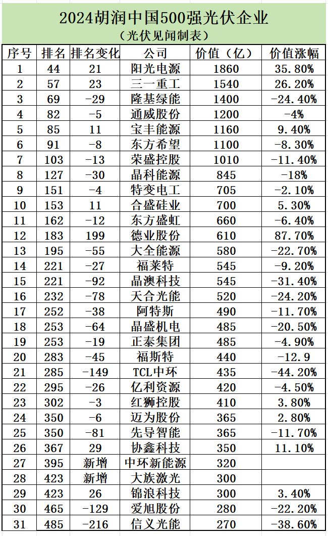 2025年2月26日,当胡润研究院最新发布的《2024胡润中国500强》榜单将聚光灯投向光伏产业时,人们看到的不仅是30余家企业组成的耀眼方阵,更是一个行业在技术迭代、市场激荡中上演的生存博弈。这份榜单像一柄三棱镜,折射出中国光伏产业在能源革命浪潮中的多维裂变——传统巨头的战略僵持、技术黑马的逆袭突围、跨界新贵的野蛮生长,共同谱写着这个万亿级产业的"冰与火之歌"。
