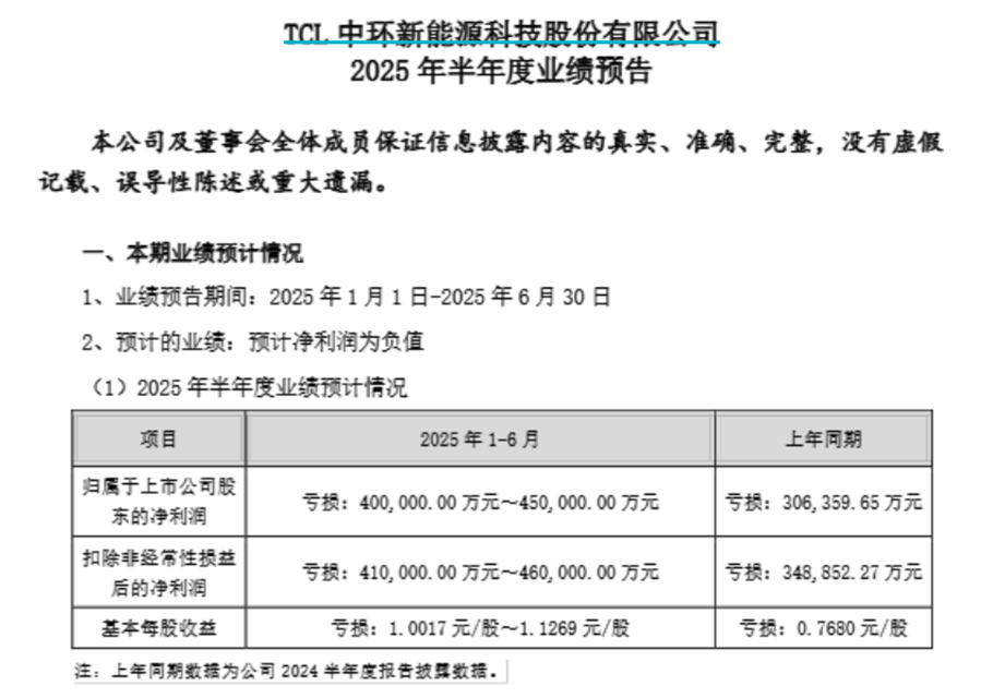 2025年7月9日晚间,TCL中环(002129.SZ)发布业绩预报称,2025年1~6月归属于上市公司股东的净利润预计亏损40亿-45亿元,上年同期亏损30.64亿元。扣除非经常性损益后的净利润预计亏损41亿-46亿元,上年同期亏损34.89亿元。