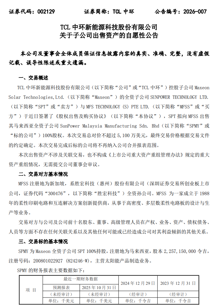 公告显示,TCL中环新控股子公司 Maxeon Solar Technologies,Ltd.(以下简称“Maxeon”)的全资子公司SUNPOWER TECHNOLOGY LTD.(以下简称“SPT”或)与 MFS TECHNOLOGY (S)PTE LTD.(以下简称“MFSS”或)于近日签署了《股权出售及购买协议》,SPT拟向MFSS出售其马来西亚全资子公司 SunPower Malaysia Manufacturing Sdn. Bhd(以下简称“SPMY”或“标的公司”)100%股权。