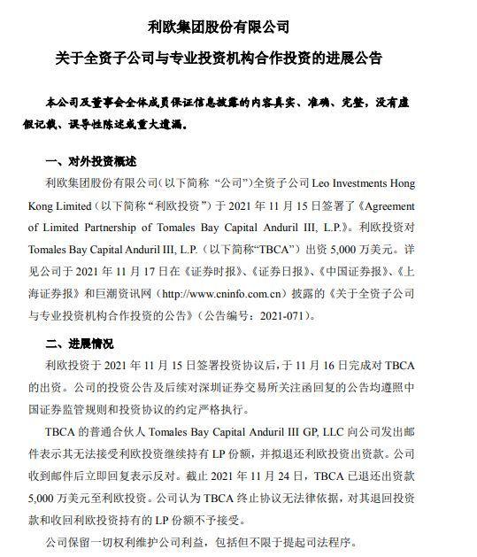 11月24日,在交易所要求日期延后两日后,利欧股份公告称公司已经签署协议并已经完成出资。
