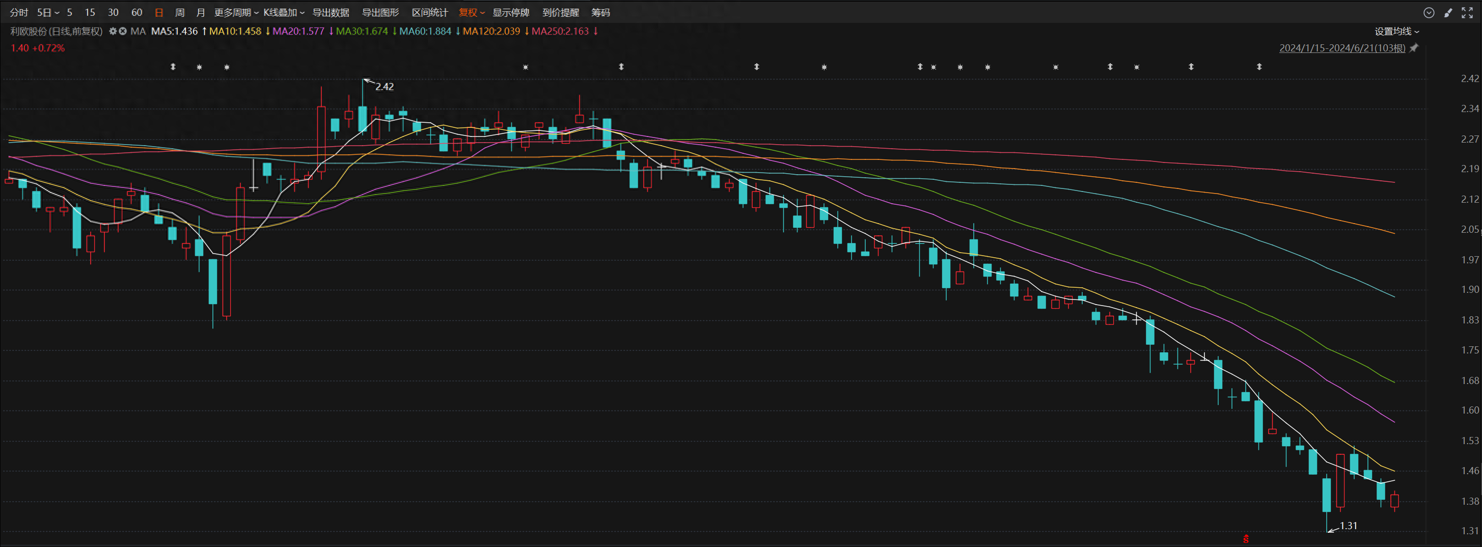 公司为水利概念股,但是近期水利板块的走强却并没有让公司的股价走俏。公司股价反而自3月下旬以来持续低迷,跌幅超过40%。截至6月21日收盘,股价报1.4元/股,总市值95亿元。