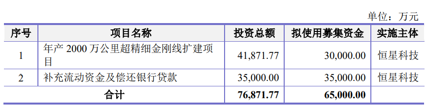 恒星科技2023年5月16日披露的向特定对象发行A股股票募集说明书(申报稿)显示,公司原拟向特定对象发行股票的募集资金总额(含发行费用)为不低于40,000.00 万元(含本数),不超过 65,000.00 万元(含本数),扣除发行费用后的募集资金净额用于“年产2000万公里超精细金刚线扩建项目”和“补充流动资金及偿还银行贷款”。